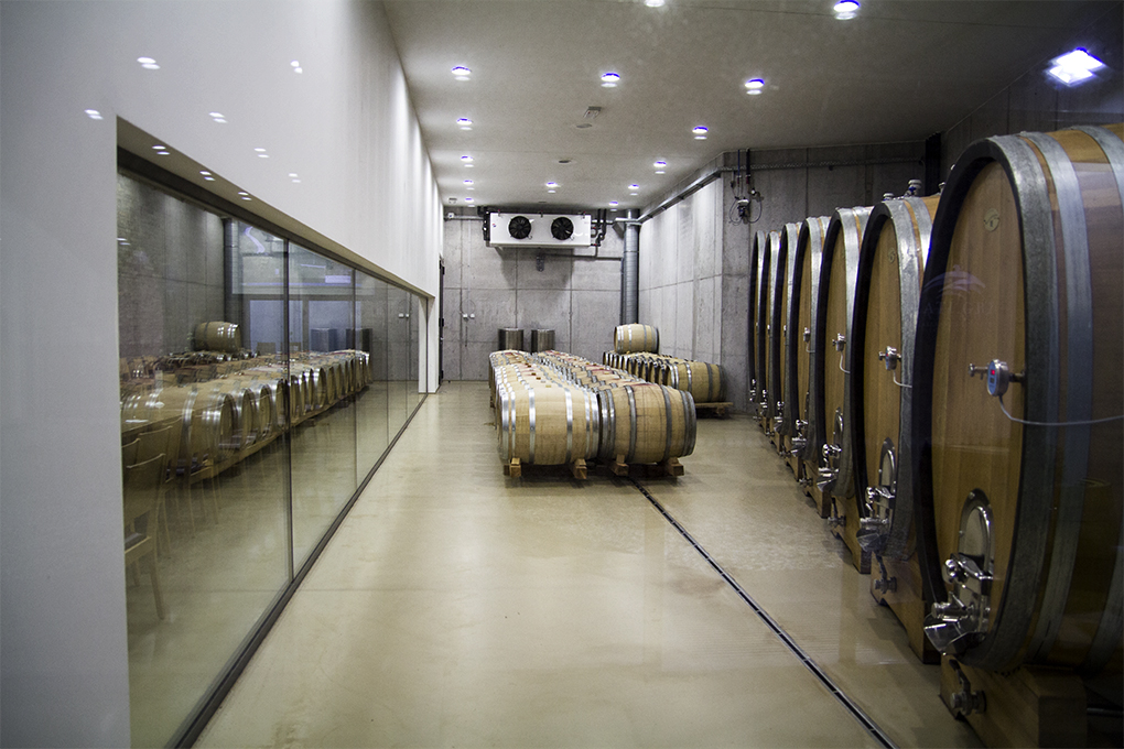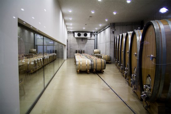 Sala degustacyjna oddzielona jest szklaną ścianą od dębowych beczek z dojrzewającym winem