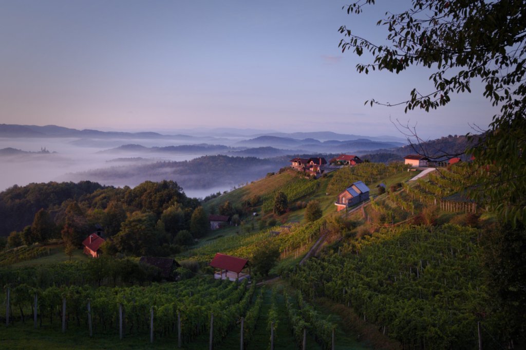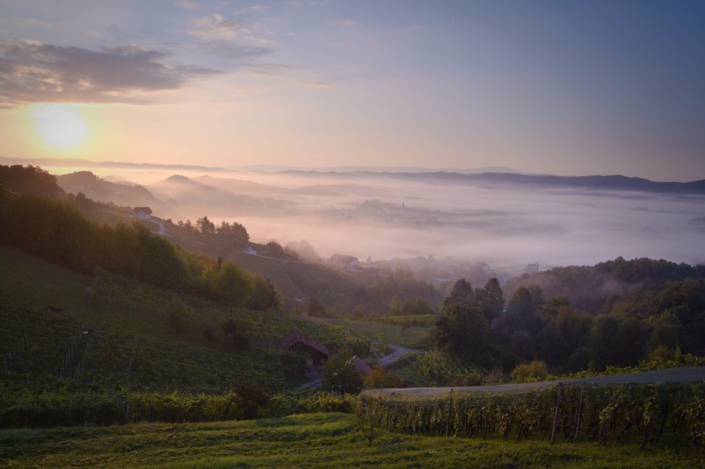 Pokręciłem się po wiosce szukając wylotówki. Osada przypomina olbrzymie rondo wokół katedry i okazało się, że łatwo pojechać w złą stronę. W końcu się udało i przez mgliste pola skierowałem się w stronę północnych wzgórz. Jesienny krajobraz zaoranych pól był ponury i aż trudno mi było uwierzyć, że gdzieś w pobliżu uprawia się winorośl. Wąska dróżka zaczęła się wkrótce wić i wspinać ostro w górę. Skrzynia biegów okazała się bardzo krótka i bardzo szybko mój opelek wlókł się na pierwszym biegu. Na szczęście mgła zaczęła się przerzedzać i wkrótce zobaczyłem błękitne niebo. Zaś w porannym słońcu pokazała się winnica rodziny Frelih, rozłożona na szczycie wzgórza.