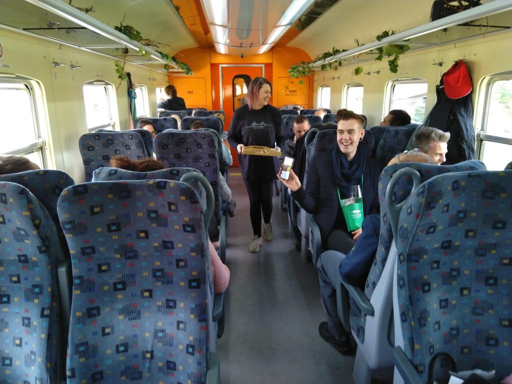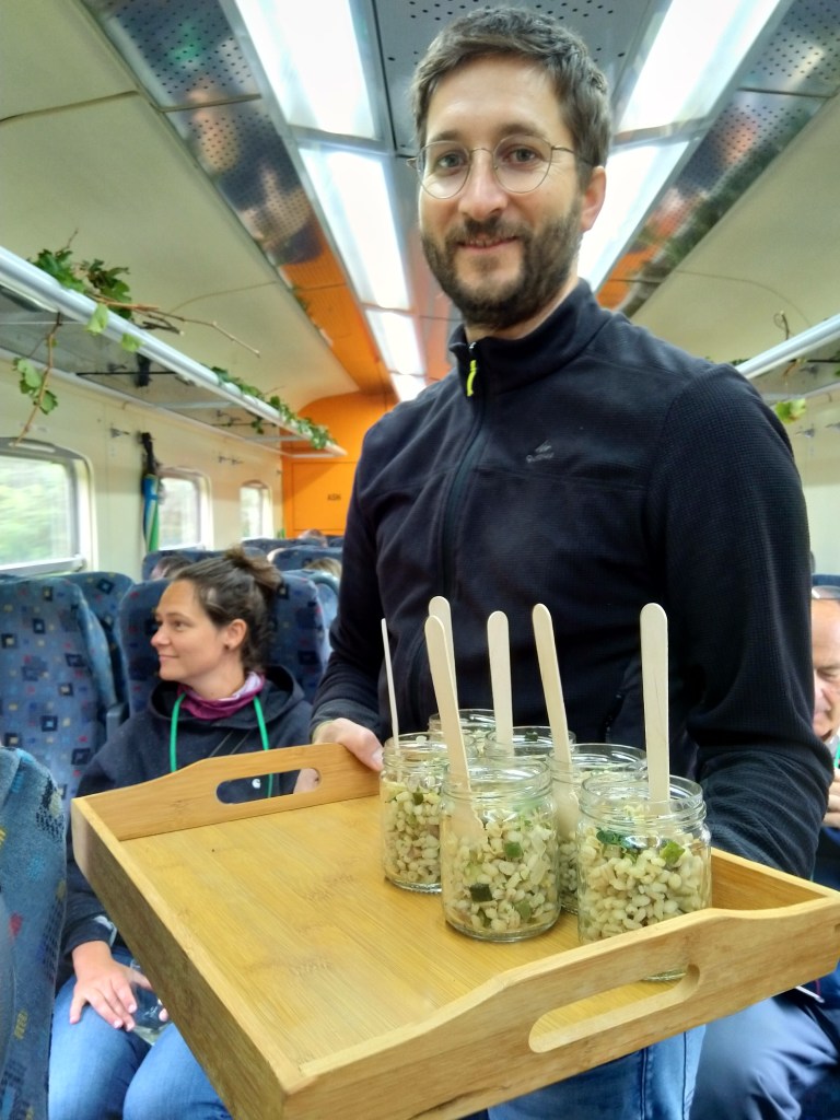Pasażerowie przy wejściu do pociągu są częstowani winem musującym. Za każdym razem w pociągu odbywają się degustacje win z innej piwnicy. W ten sposób organizatorzy chcą pokazać jak najwięcej lokalnych producentów i jednocześnie urozmaicić swoją ofertę. We wrześniowej edycji zaprezentowała się winnica Štrancar. W trakcie podróży do Ajdovščiny spróbowaliśmy trzech win. Wszystkie trzy z lokalnych odmian: zelen i malvazija. Zelen, to endemiczna odmiana, która występuje jedynie w Dolinie Wipawy. W pociągu została zaprezentowana w dwóch wariantach: jako wino musujące oraz spokojne. Zelen daje wina o wyraźnych aromatach ziołowych. Szczególnie ciekawie wychodzą wina musujące, które zdobywają coraz większe uznanie wśród winolubów. Malvazija z kolei jest szczepem, który dominuje w całym regionie Primorje, w skład którego wchodzi Dolina Wipawy. Degustacja urozmaicona jest także przekąskami z sezonowych i lokalnych składników.