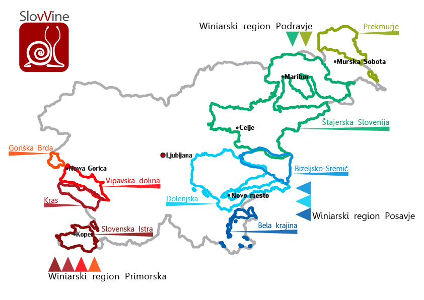 Winorośle w Słowenii uprawia się w trzech regionach: Podravje, Posavje i Primorje, które z kolei dzielą się na 9 obszarów (sł. okoliše). [źródło] Podravje jest największym regionem, zajmuje ponad 40% powierzchni wszystkich słoweńskich winnic. Podravje znajduje się w północno-wschodniej Słowenii w dorzeczu rzeki Drawy, skąd pochodzi jego nazwa. Region dzieli się na dwa obszary: Słoweńska Styria (Slovenska Štajerska) oraz Prekmurje. Styria jest największym winnym obszarem w kraju (około 6 000 ha winnic). Na charakter win Podravja największy wpływ miało winiarstwo austriackie. W regionie tym uprawia się przede wszystkim białe szczepy winorośli – 93%. Drugim co do wielkości regionem jest Primorska, która dzieli się na cztery obszary: Słoweńska Istria (Slovenska Istra), Kras, Vipavska Dolina (Dolina Vipavy) oraz Goriška brda (wł. Collio). Region Primorska charakteryzuje się klimatem śródziemnomorskim z wpływami alpejskimi. Na charakter winiarstwa na tym terenie wpływ miało winiarstwo włoskie. W uprawie przeważają odmiany jasne – 55%. Najmniejszym słoweńskim regionem jest Posavje. Dzieli się na trzy obszary: Bizeljsko – Sremič, Dolenjska i Bela krajina. Posavje znajduje się w dorzeczu rzeki Sawy w południowo-wschodniej części kraju. Jest to jedyny region, gdzie dominuje uprawa ciemnych odmian winorośli – 58%. [źródło]
